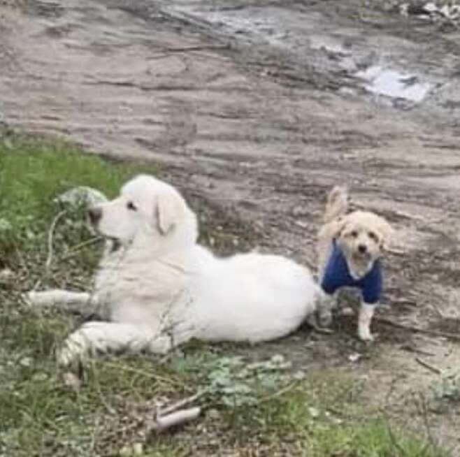 Sans perdre de temps, Hall s’est précipitée vers un talus sur le bord de l’autoroute, l’endroit où les chiots avaient été vus pour la dernière fois. Elle a fouillé les buissons à proximité avant de découvrir un grand Pyrénées incapable de bouger, accompagné d’un petit chiot à poils durs qui refusait de la quitter.