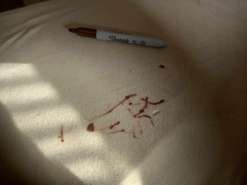 Récemment, alors qu’Erik se trouvait à la maison avec Flora, profitant d’un moment d’inattention, il s’empara d’un nouveau jouet parmi les affaires de celle-ci – en l’occurrence, un marqueur permanent marron.