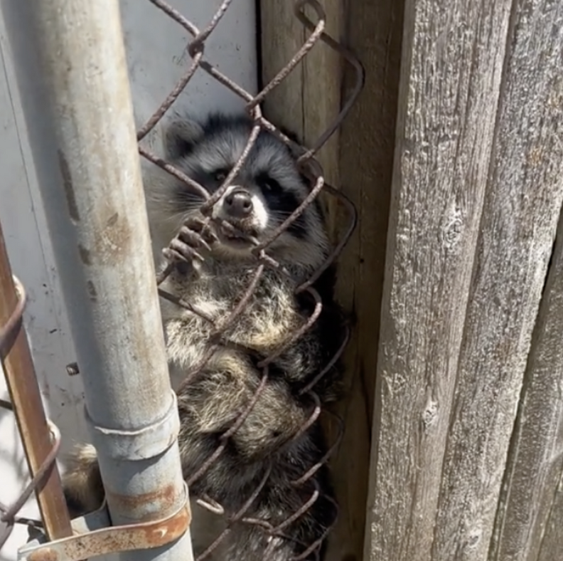 S’approchant du tumulte, elle aperçut une boule de poils piégée dans sa clôture, tandis qu’à proximité se trouvait une mère raton laveur en détresse. Rapidement, la femme fit le lien : la boule de poils était en réalité une paire de bébés ratons laveurs coincés désespérément, et leur mère, incapable de les atteindre, lançait un appel à l’aide déchirant