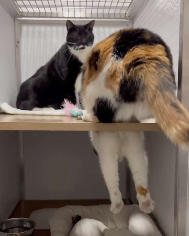 Après avoir reçu un bilan de santé favorable, les chats – Theodore, tuxedo et Juniper, la calico – se installèrent ensemble dans un enclos en attendant l’arrivée de leurs nouveaux parents d’accueil.