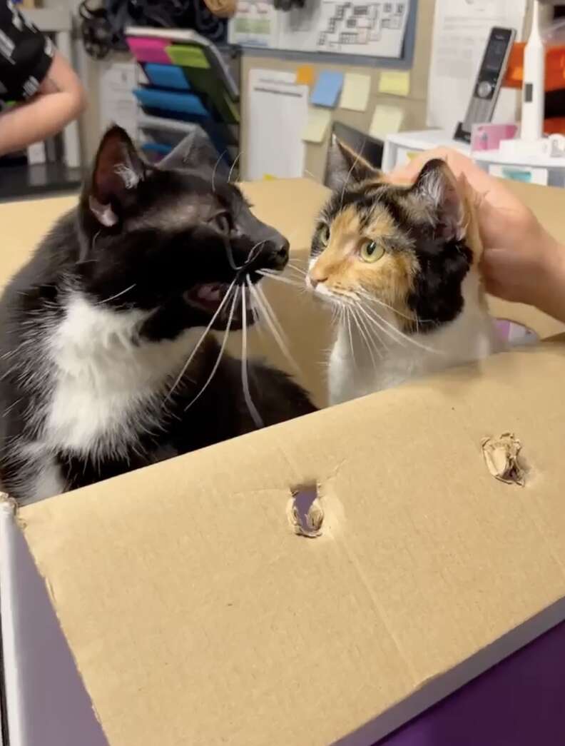 « D’après nos expériences passées, nous avons pensé que c’était une boîte de chiots ou de chatons », ajouta Fornea. « Nous avons été surpris de découvrir deux chats adultes. »