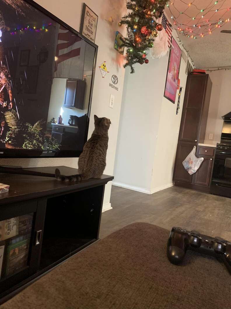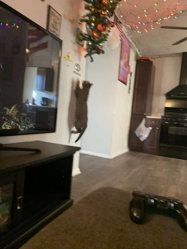 Il semblerait que Kanye ait considéré le déplacement du sapin de Noël au plafond comme un défi, un défi qu’il était plus qu’heureux de relever. Le chat a commencé à élaborer un plan.