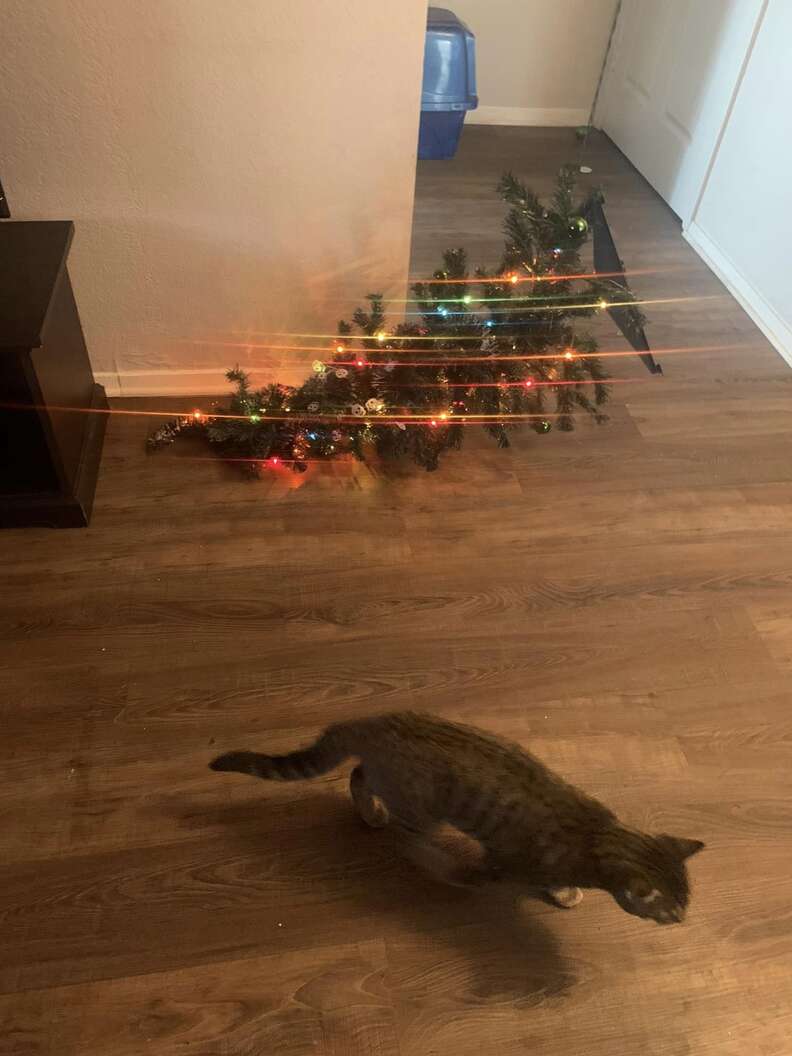 Daniel James Wallace, le maître de Kanye, a décidé cette année de décorer son chez-soi avec un mini-sapin de Noël, parfaitement adapté pour que son chat puisse l’apprécier davantage. Mais une fois paré de lumières et d’ornements scintillants, l’appréciation de Kanye ressemblait étrangement à de la destruction. Ses petites pattes ne pouvaient s’empêcher d’y toucher.