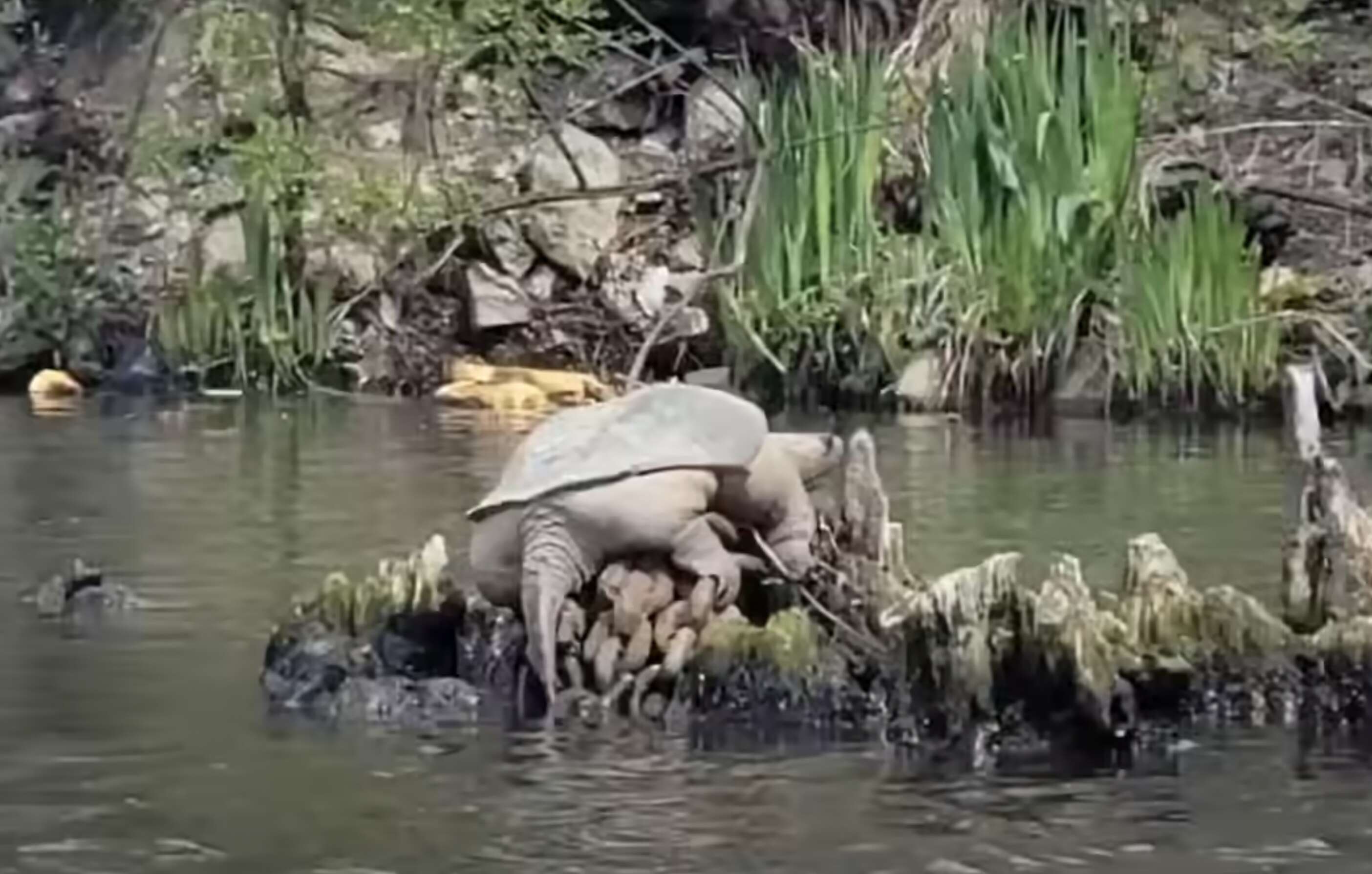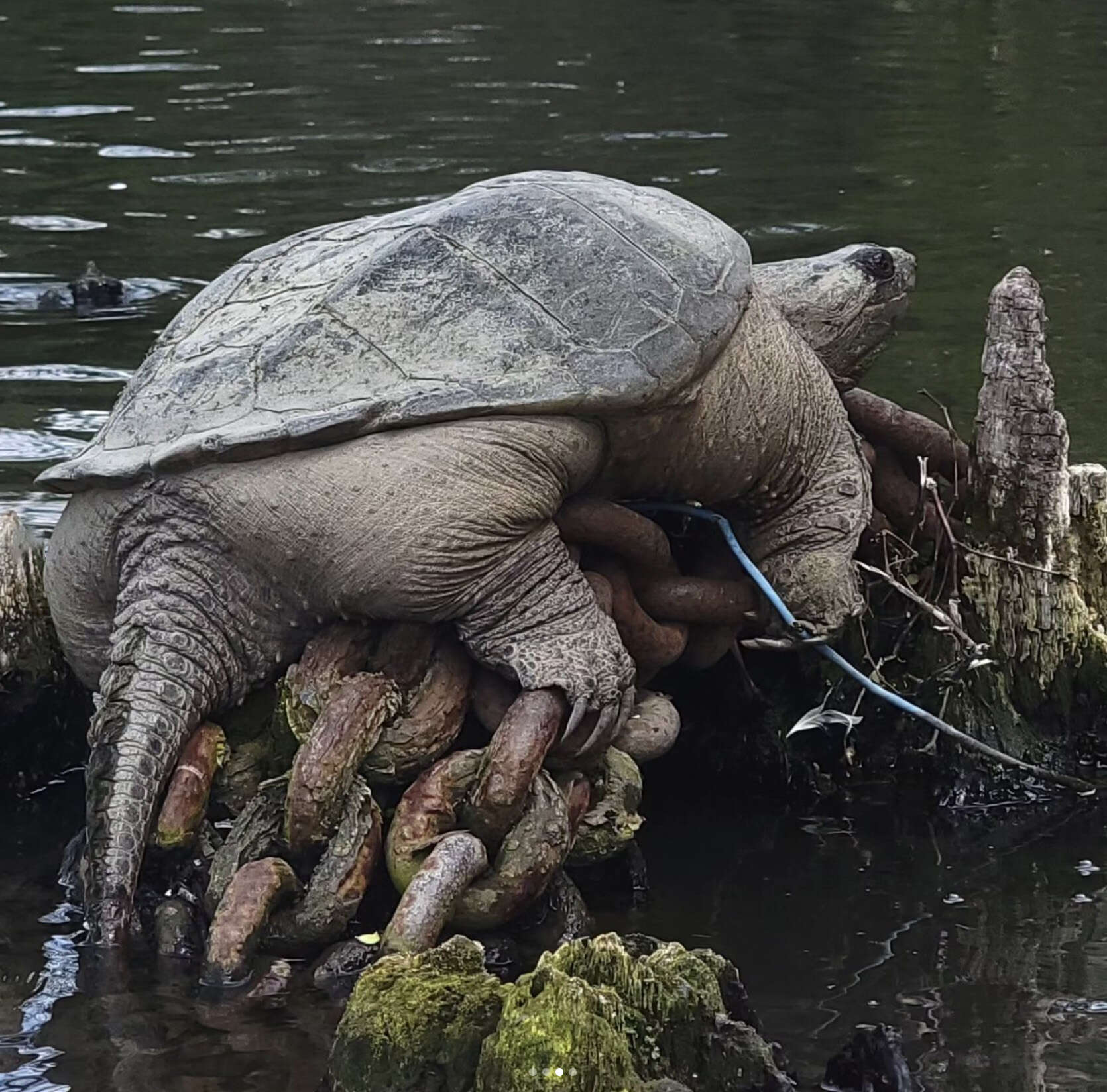 J. Santore et un ami faisaient du kayak sur la rivière de Chicago lorsqu’ils ont été intrigués par quelque chose. Là, perché sur un îlot au milieu de l’eau, se trouvait une énorme tortue serpentine. En vérité, elle était impossible à manquer. En s’approchant pour l’examiner de plus près, Santore a pu observer la corpulence exquise de la tortue – son postérieur dodu réchauffé par le soleil printanier éclatant. “Elle devait peser au moins 27 kilos”, a déclaré Santore à The Dodo. La tortue était tellement robuste qu’elle semblait presque porter une carapace plusieurs tailles trop petites.
